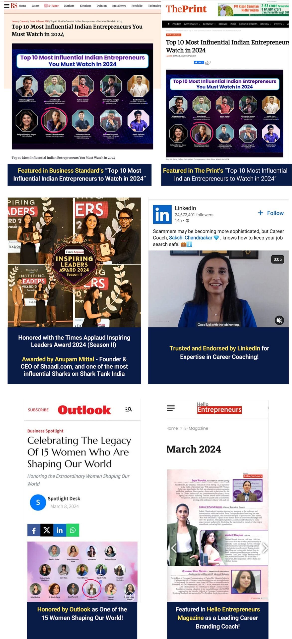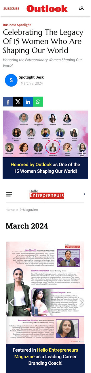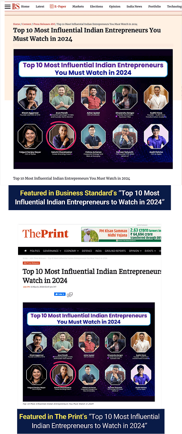 Recognized as one of 2024’s Top 10 Indian Entrepreneurs and featured among the Top 15 Women Shaping India by Outlook and Hello Entrepreneurs, I’ve also been named one of the Top 10 Personalities Spreading Knowledge by Business Standard.